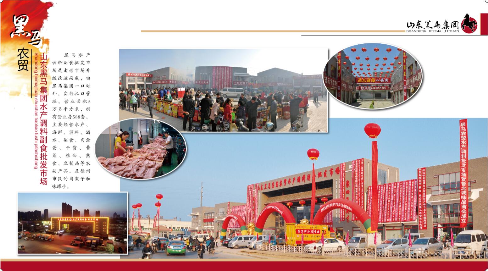 黑馬水產(chǎn)調(diào)料副食批發(fā)市場是由老市場升級改造而成,由黑馬集團(tuán)一口對外,實(shí)行扎口管理。主要經(jīng)營水產(chǎn)、海鮮、調(diào)料、酒水、副食、肉禽蛋、干貨、醬菜、糧油、熟食、豆制品等農(nóng)副產(chǎn)品。是德州市民的肉案子和味罐子。