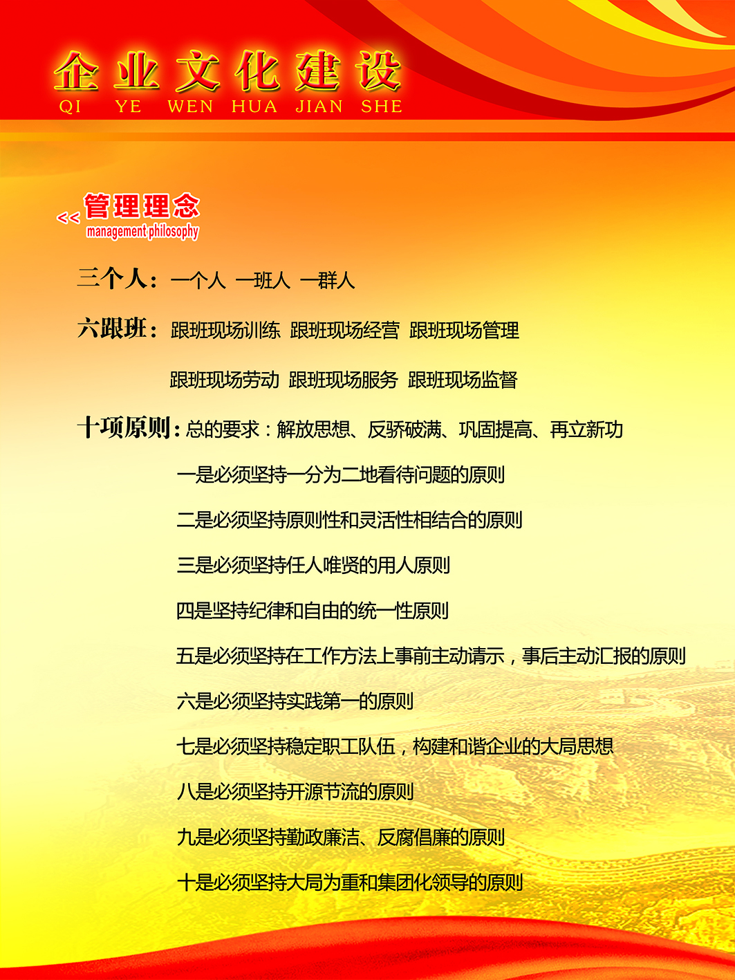 山東黑馬集團自創(chuàng)辦以來,企業(yè)文化處處體現(xiàn)著軍隊色彩。董事長劉玉江有著22年的軍旅生涯,把最美好的青春奉獻給了軍隊,對軍隊有著特殊的感情,曾榮獲“山東省優(yōu)秀退役軍人”、“全國模范軍轉(zhuǎn)干部”等榮譽稱號。退役后他總結(jié)多年企業(yè)經(jīng)營管理經(jīng)驗,提出了“十項原則”、“六跟班制度”和抓好“三個人”的管理理念,實行“三三制”工作法等,在教育影響職工、推進集團規(guī)范、統(tǒng)一、快速發(fā)展中發(fā)揮了重要作用。