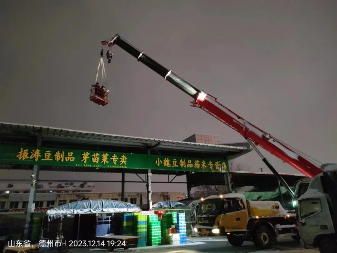 市場(chǎng)組織人員連夜清除棚頂積雪。