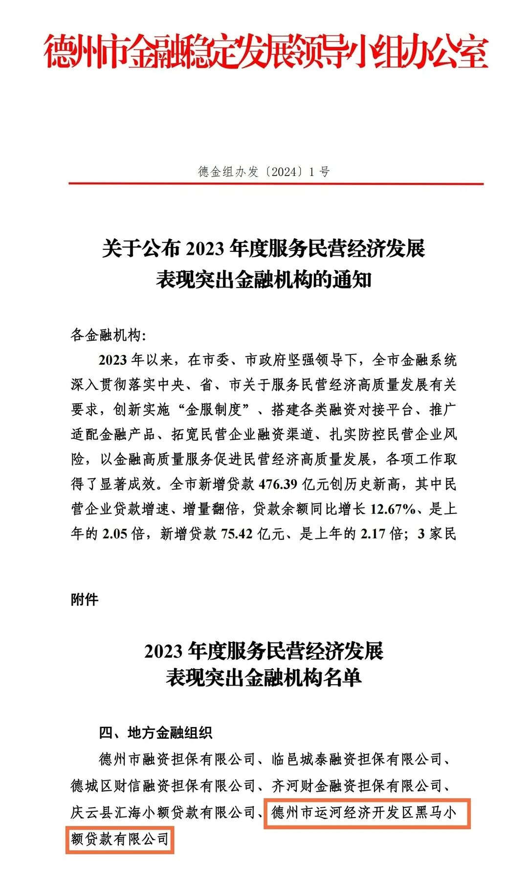 近日,德州市金融穩(wěn)定發(fā)展領(lǐng)導(dǎo)小組辦公室印發(fā)《關(guān)于公布2023年度服務(wù)民營(yíng)經(jīng)濟(jì)發(fā)展表現(xiàn)突出金融機(jī)構(gòu)的通知》,對(duì)服務(wù)民營(yíng)經(jīng)濟(jì)發(fā)展表現(xiàn)突出金融機(jī)構(gòu)給予通報(bào)表?yè)P(yáng),黑馬小額貸款有限公司位列其中,充分肯定了黑馬小額貸款有限公司在支持和推動(dòng)民營(yíng)經(jīng)濟(jì)高質(zhì)量發(fā)展所取得的成績(jī)及做出的貢獻(xiàn)。