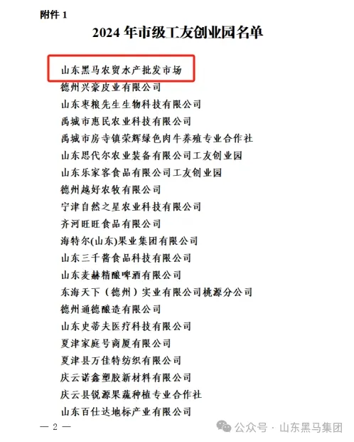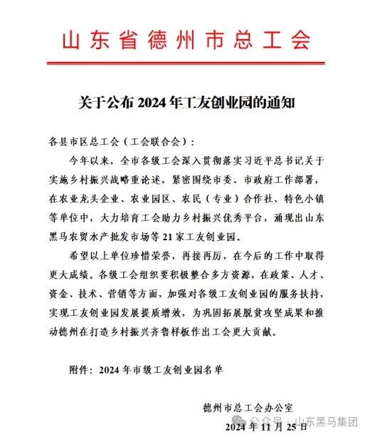 近日,山東黑馬農(nóng)副產(chǎn)品批發(fā)市場成功入選2024年市級工友創(chuàng)業(yè)園。