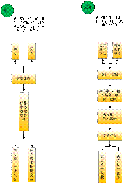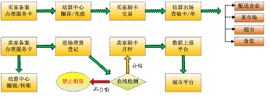 黑馬蔬菜電子結(jié)算系統(tǒng)建設(shè)完成后,商戶和消費(fèi)者使用追溯交易一體機(jī),提供個(gè)人或企業(yè)合法的身份證明,到電子結(jié)算中心進(jìn)行備案登記及發(fā)卡,提供商品來源信息供市場登記備案,買賣雙方持卡進(jìn)行交易。